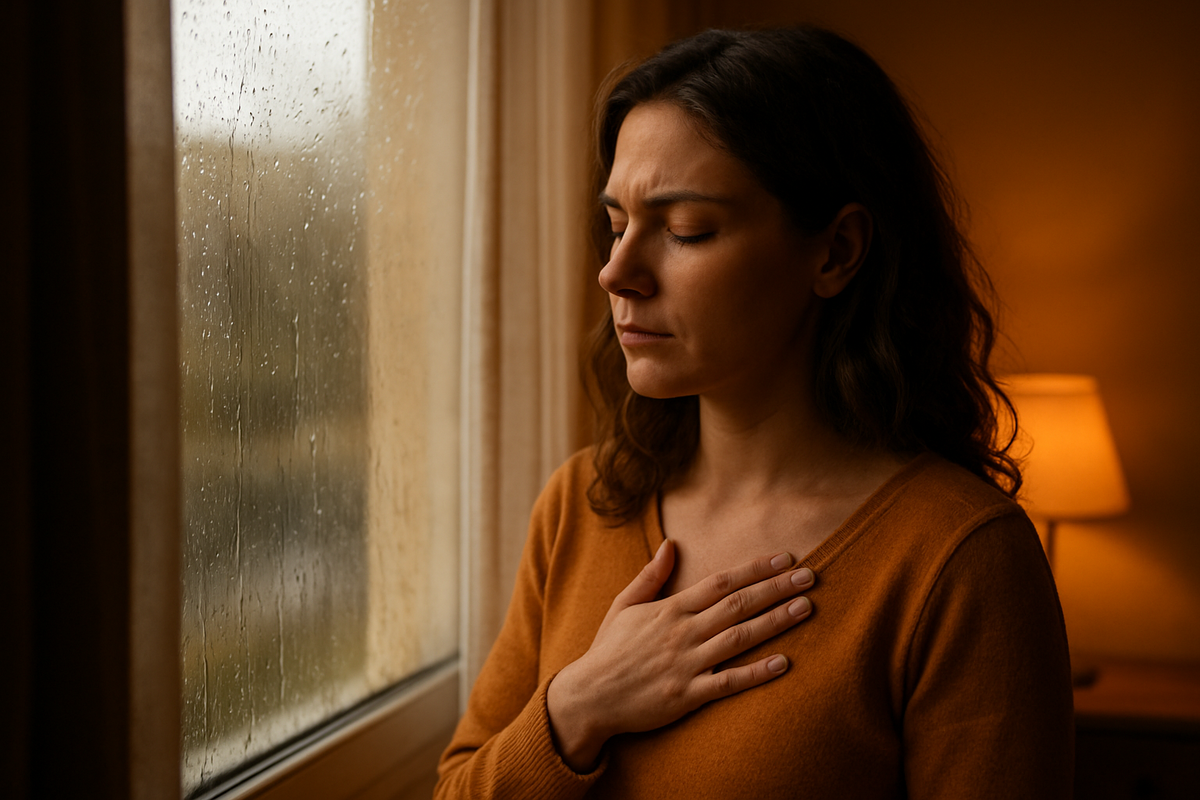 Стоя у окна, женщина наблюдает за дождём, с потеками на стекле, её остывающий чай оставил на душе лишь холод. Время словно остановилось.