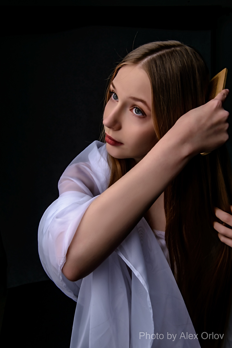 Однако, попросив модель просто расчесаться, мгновенно удалось поймать красоту в её естественном состоянии. Её чистое, почти кукольное лицо стало идеальным фоном для фотографии, и это был тот самый момент, который ищется художниками.