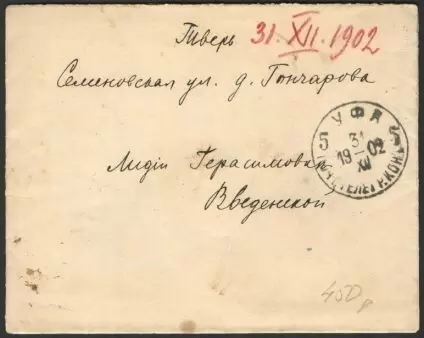 Обратного адреса не видно, да и фамилия отправителя скрыта, но из текстов становится ясно, что их автором был некто Евгений. На этих конвертах четко поставлены почтовые штемпели: уфимские за 31 декабря 1902 года и 5 января 1903 года, а также тверские от 4 и 9 января 1903 года. В то время почта работала так же быстро, как и сегодня — письма из Уфы в Тверь доходили менее чем за неделю.