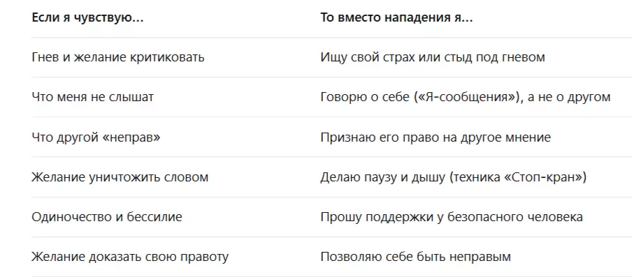 Первым шагом является осознание собственных триггеров — что вызывает агрессию. Часто за ней скрываются страхи или стыд. Рекомендуется использовать я-сообщения для формирования здорового общения, а не нападения на партнера.
