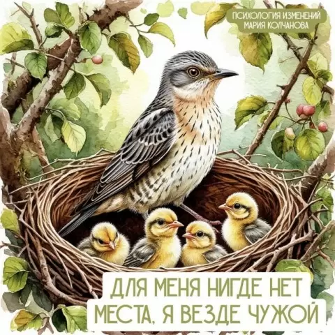 - Чужое гнездо: Человек, даже находясь в кругу близких, может чувствовать себя чужим, как кукушонок среди других птенцов, не встраиваясь в семейную динамику и оставаясь лишним звеном.