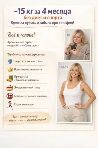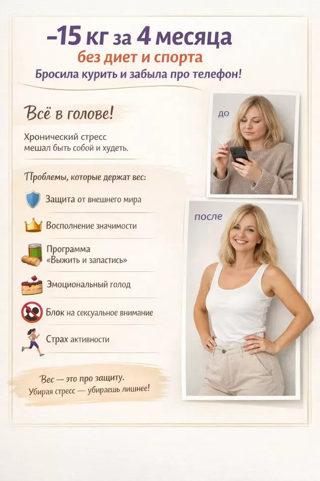 О похудении и речи не шло. Наша основная задача заключалась в восстановлении связи с собой и своими истинными желаниями. Когда мы начали работать с её внутренним напряжением, свершилось неожиданное: исчезли не только тревога и зависимость от телефона, но и 15 килограммов лишнего веса.