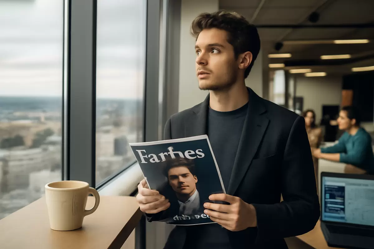 Коля подбросил мне журнал через стол, обращая внимание на обложку. На ней — лицо Максима Дронова, одетого в элегантный костюм и с серьезным выражением. Под заголовком: «Молодой предприниматель года».