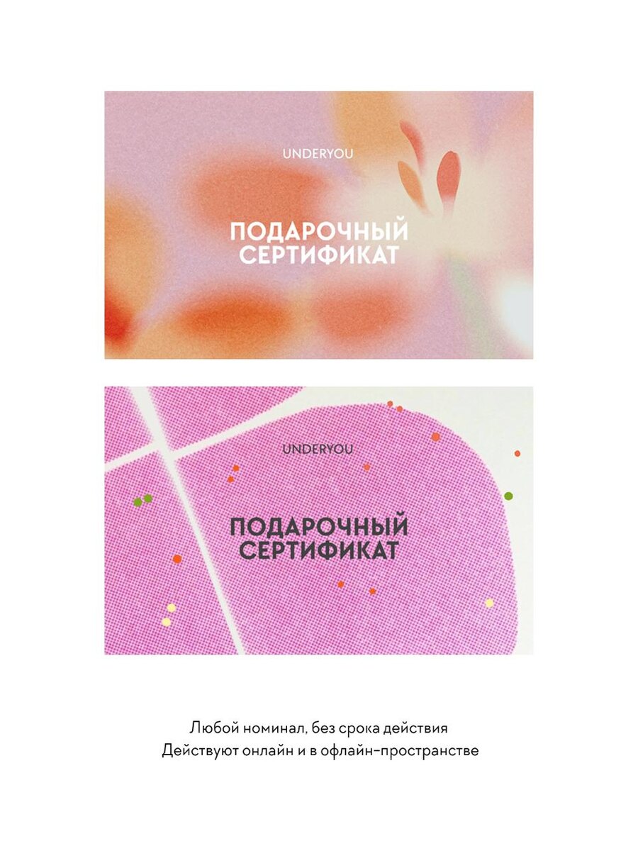 Главное преимущество — возможность выбрать номинал по собственному усмотрению. Эти сертификаты не подлежат ограничению по сроку действия, что добавляет гибкость в их использование. Кроме того, они действительны как на сайте underyou.ru, так и в ТЦ «Метрополис». Это идеальный вариант, который позволяет сделать выбор подарка максимально удобным для каждого.