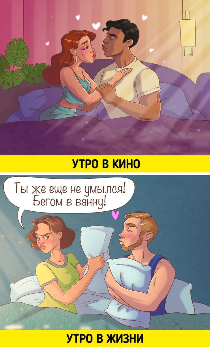 Комиксы, которые были разработаны талантливыми художниками, предлагают нам увлекательные сравнения между романтическими моментами на экране и в жизни.