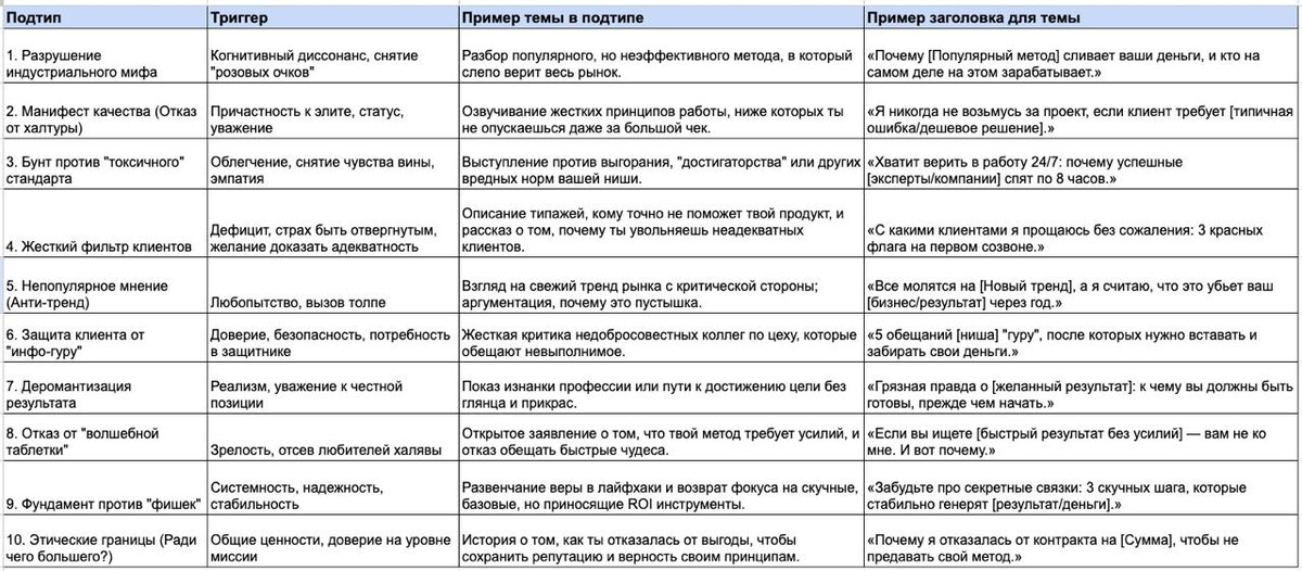 Чтобы помочь в создании идеологического контента, существует множество идей и примеров. В Контент-Матрице можно найти более 1000 идей, из которых около 340 посвящены именно идеологическому слою — с подтипами, триггерами и наглядными примерами.